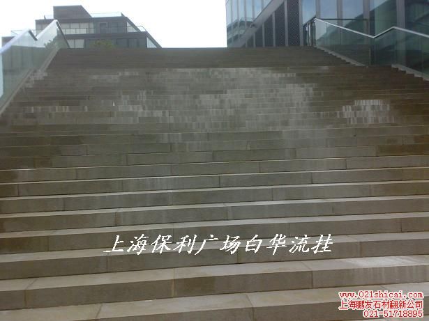 3、白華現(xiàn)象?俗稱流眼淚?。由于濕法施工,石材背面灌注水泥沙漿,雨水摻入水泥沙漿中,溶解其中的鈣或鹽成份,有鈣、鹽成分的水分滲入右材毛孔填縫不實(shí)處,天長(zhǎng)日久形成水道滲出表面,與空氣中的Co2、酸雨等接觸,生成不溶解的白色物——白華。