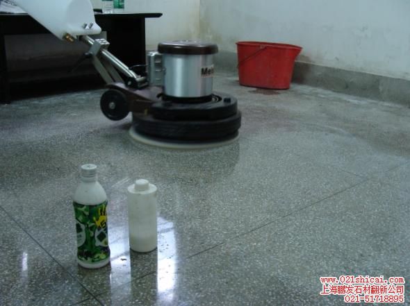 水磨石歸屬人造石材,具有密度大、硬度高、耐磨、不生塵、不易剝落等特點(diǎn)。水磨石是以水泥、色粉、石米,石英砂按照一定比例澆注、打磨而成。其以造價(jià)低廉,形狀顏色可控,施工方便等優(yōu)點(diǎn),廣泛應(yīng)用于公共場(chǎng)所及生產(chǎn)車間、倉庫廠房、學(xué)校等,然而由于目前施工技術(shù)沿用舊式方法的粗糙打磨,加上水磨石粗磨后毛細(xì)孔的粗大,易藏污納垢,易被磨損和各種水性、油性污漬滲透,導(dǎo)致表面風(fēng)化剝離,起塵,出現(xiàn)細(xì)小孔洞和污染。隨著天然裝飾建材業(yè)的興起,普通水磨石市場(chǎng)競(jìng)爭(zhēng)力日趨下減。究其原因是普通水磨石是靠清洗和表面打蠟拋光才能獲得短時(shí)間內(nèi)較好的表面效果,其日常清洗打蠟工作復(fù)雜而難操作,且成本較高,導(dǎo)致人們不愿意經(jīng)常打蠟。我公司通過實(shí)踐總結(jié)并學(xué)習(xí)國(guó)外先進(jìn)的技術(shù),整理出一套先進(jìn)的水磨石翻新及結(jié)晶處理工藝,通過石材翻新機(jī)配合不同號(hào)數(shù)的磨片(塊)、對(duì)水磨石進(jìn)行粗、細(xì)、精三道打磨,封堵微細(xì)孔,強(qiáng)化內(nèi)部結(jié)構(gòu),然后再用高分子聚合物結(jié)合表面滲透劑在水磨石表面通過熱摩擦、使藥劑與水磨石表面產(chǎn)生化合反應(yīng),生成堅(jiān)硬耐磨、高光亮度、防水防污,易于清潔保養(yǎng)的致密晶體保護(hù)層。同時(shí)水磨石表面產(chǎn)生高光亮鏡面效果。經(jīng)翻新打磨晶化后的水磨石光澤度、硬度、防污性能,吸水性均可與大理石媲美,可使普通水磨石也能和大理石一樣高雅華貴。它適用于舊水磨石和新制成的水磨石表面,大大提高水磨石的商業(yè)價(jià)值和市場(chǎng)競(jìng)爭(zhēng)力。